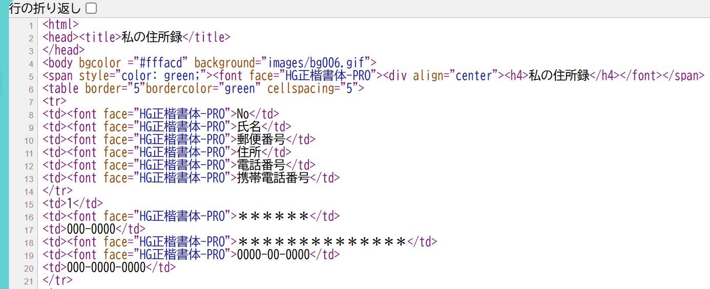 となりますので「TerPad」などのテキストエデイタにコピーしデータを入力します、入力が終わりましたらhtmlの拡張子で「私の住所録」の名で保存、デスクトップに保存したらそのアイコンをクリックすると住所録が見られます。