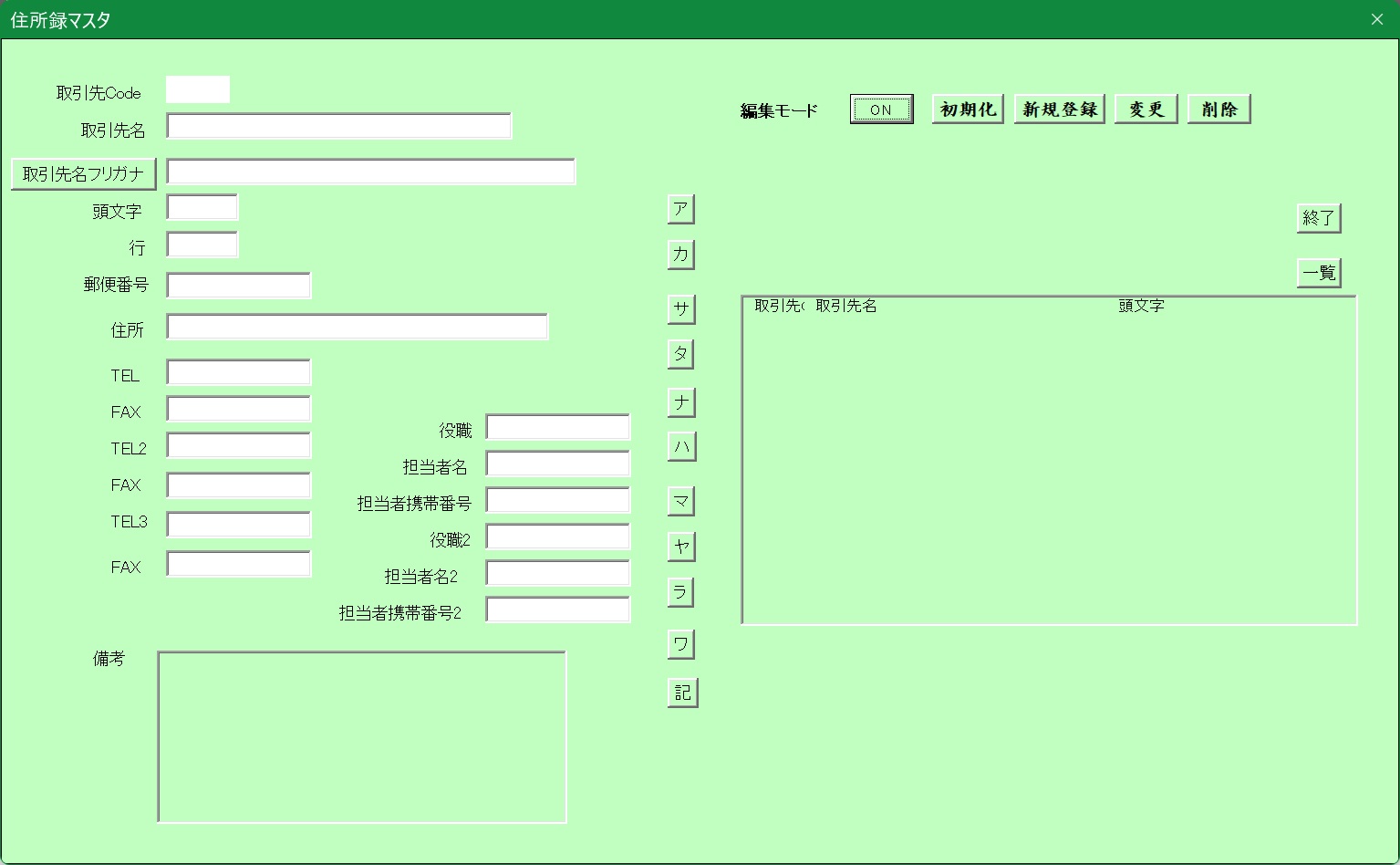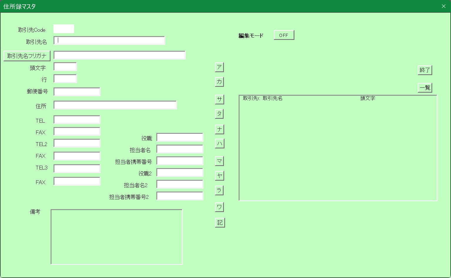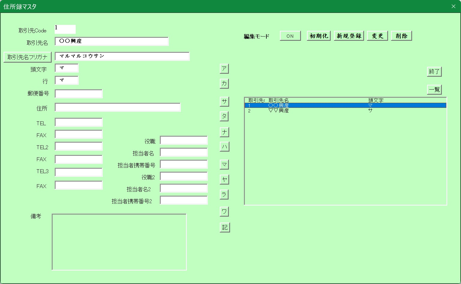 そして、「取引先名」を入力、「取引先名フリガナ」ボタンクリックするとフリガナと「頭文字」「行」が自動的に入力されますので郵便番号から備考まで入力、住所は全角でハイフン入りで打ちスペースキーを叩くと住所に変換されます。