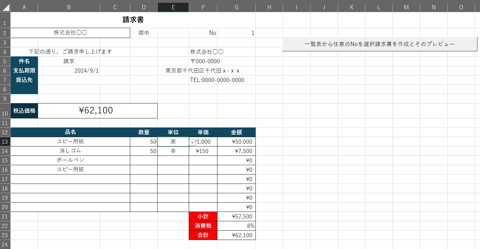 上のように一覧表シートはなり、請求書テンプレートは