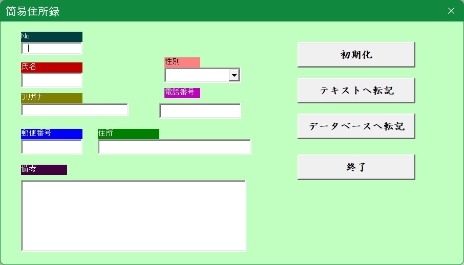 が表示されますのでデータ入力します。「テキスト転記」ボタンをクリックするとNoが入力されますので備考まで入力、性別は▼をクリックして選びます。住所は全角ハイフォン入りで打ち込みスペースキーを叩くと住所に変換されます。入力が終わりましたら「データベースへ転記」ボタンをクリックすれば背後のデータベースに転記されます。「初期化」をクリックすると個票の1件のデータがクリアーされます。