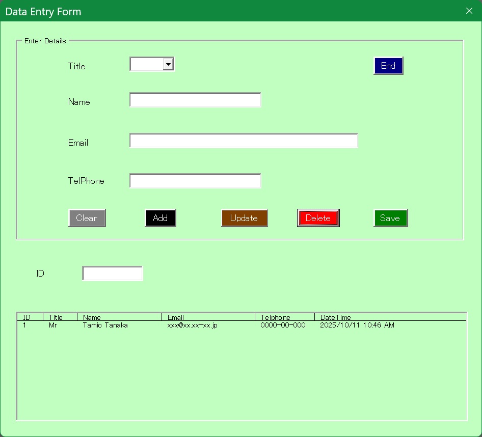 終わって消去したいデータがあった場合そのID番号をIDに入力し「赤Delete」キーをクリックすればそのデータが削除されます。Dataシート内のそのデータも削除されます。