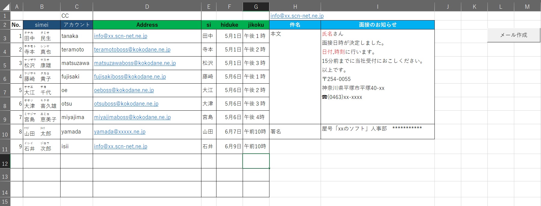 「メール作成」ボタンクリックで入力件数分連続でメールが出来上がるので件数分「送信」をクリックしてあげればメール送信が一挙にできます。