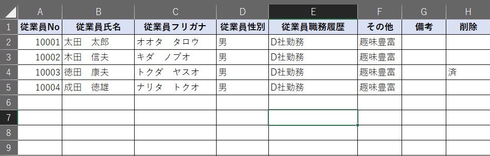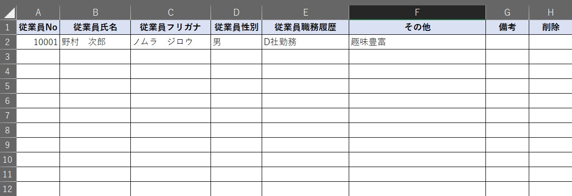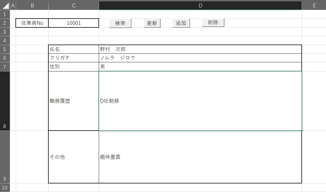 立ち上げましたら、まず、従業員Noを10001と入れ「検索」ボタンをクリックすると、最初の従業員のダミーが表示されますので上書きで入力してください、次に従業員Noを10002と入力し、データを入力してください。そして「追加」ボタンをクリックすると従業員一覧シートに転記されます。削除したい場合は削除したい従業員Noを入力し個票の「削除」ボタンをクリックするとデータベースの「削除」の欄に「済」の名が入ります。更新はデータベースの方で行ってください。