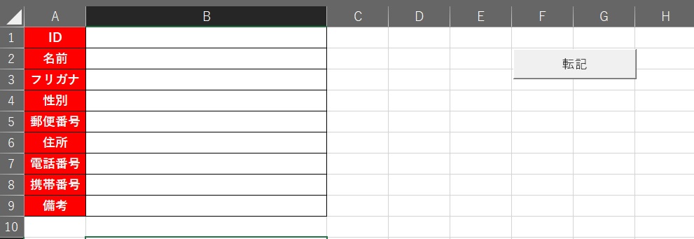 このシートでデータ入力、住所は全角ハイフォンつき郵便番号をうち、スペースキーを打つと住所が入力されます。そして、「転記」ボタンクリック