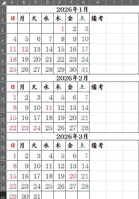 部分を変え上にある「マクロの実行ボタン▶」をクリックしExcelに戻るとカレンダーが作成されています。